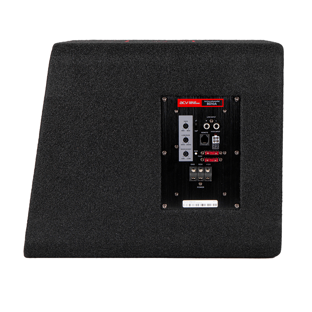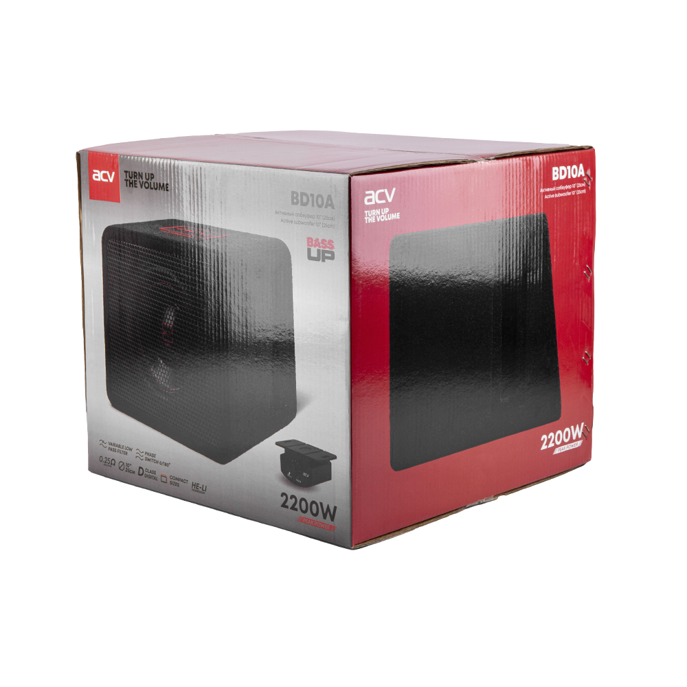 ACV BD10A обладает достаточно компактными размерами, что позволит сэкономить много места в автомобиле. Особенностью конструкции является Фазоинверторный корпус, точно рассчитанный под мощный НЧ динамик 10 дюймов, тяжелый и массивный. Для сабвуфера использована целлюлоза с пропиткой, крупный резиновый подвес обеспечивает необходимую амплитуду движений. Сабвуфер “качает” современный высокоэффективный цифровой усилитель класса D, изготовленный по технологии HE-LI (High Efficiency Low Impedance - Высокая эффективность до 95% класса D / низкий импеданс). Встроенный новейший низкоомный цифровой усилитель выдаёт мощность 400 Вт при 0,25 Ом, что позволило добиться максимальной производительности устройства. Внутри сабвуфера – высокотемпературная двойная звуковая катушка 2 дюйма c сопротивлением 1+1 Ом, магнит 45 унций, чувствительность 89 ±2 дБ. Тандем современных комплектующих с проверенными технологиями позволяют демонстрировать SPL 109 ±2 дБ.