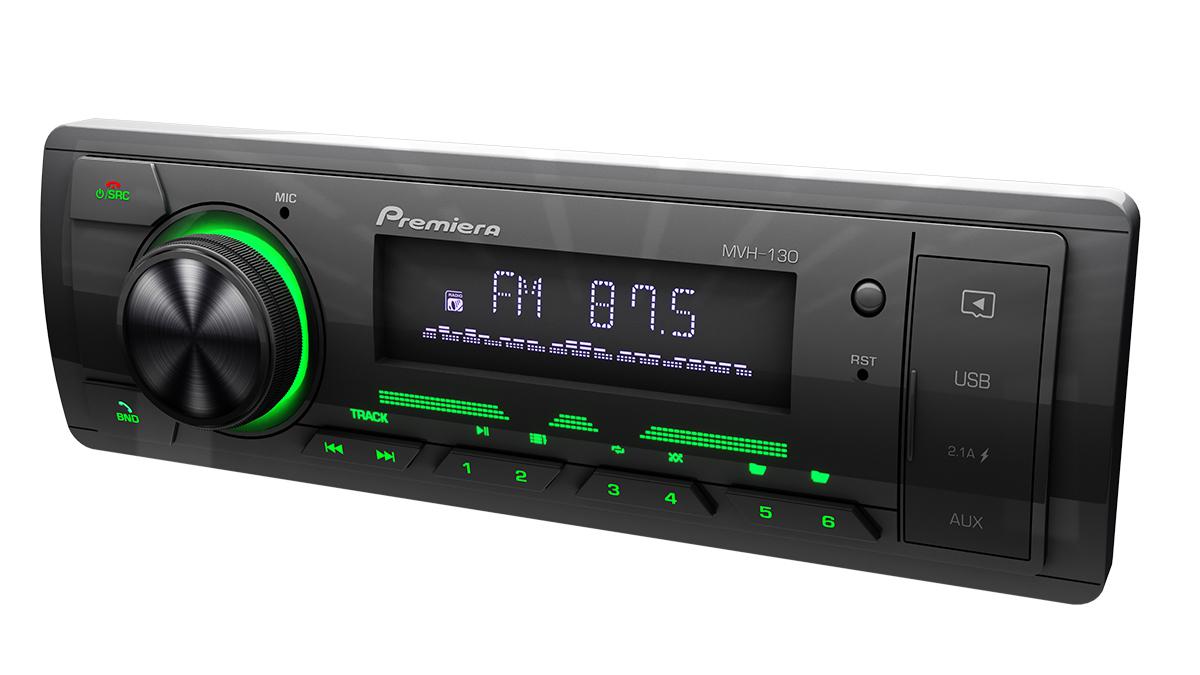 Premiera MVH-130 FM/ SD/ USB ресивер с поддержкой беспроводной технологии Bluetooth — это современная и многофункциональная автомагнитола стандартного установочного размера 1DIN, которая при этом имеет минимальную монтажную глубину — всего 35 мм.