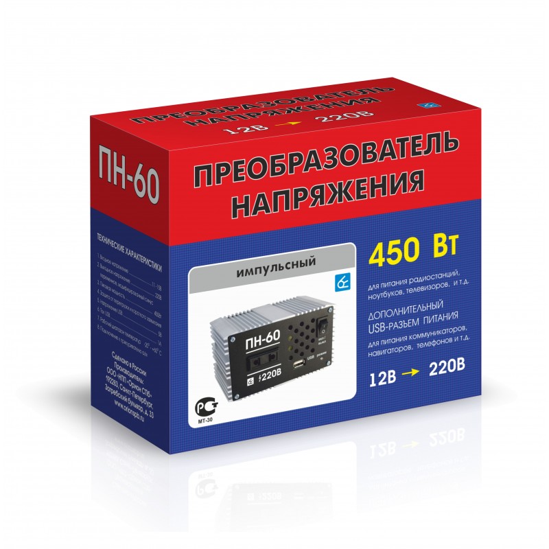 Импульсный преобразователь напряжения Вымпел ПН-60, он же инвертор, служит для преобразования напряжения 12В в эффективное напряжение 220В, модифицированный синус, благодаря чему от бортовой сети автомобиля можно запитать почти любые бытовые приборы (мобильный телефон, фен, утюг, ноутбук и т.д.).