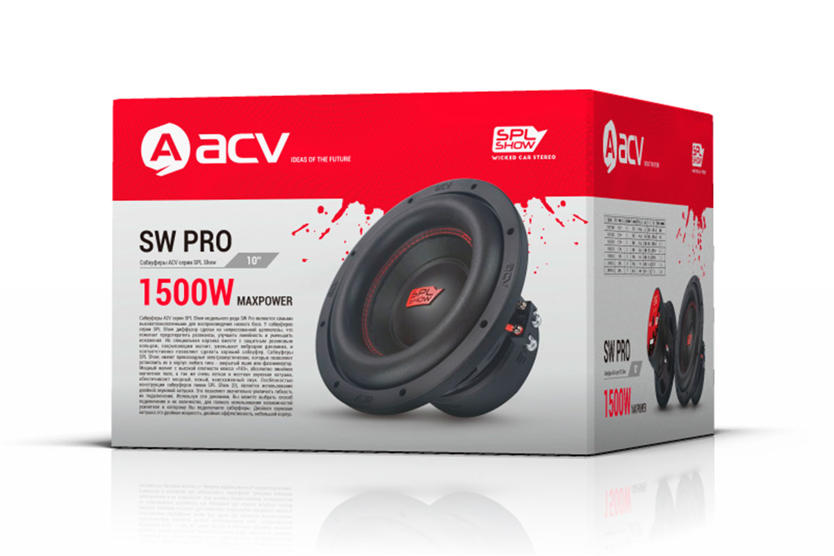 Сабвуферы ACV серии SPL Show модельного ряда SW PRO являются самыми высокотехнологичными для воспроизведения низкого баса. У сабвуферов этой серии диффузор сделан из непрессованной целлюлозы, что помогает предотвратить резонансы, улучшить линейность и уменьшить искажения.