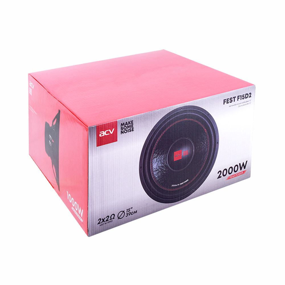 В сабвуферах ACV серии FEST реализованы проверенные и надежные технологические решения для воспроизведения низкого баса в автомобиле. Жёсткий и легкий диффузор из непрессованной целлюлозы, 2 высококачественных ферритовых кольца общим весом 100 унций, высокотемпературная двойная 2,5-дюймовая катушка, 10-дюймовая шайба, прошитые подводящие, подпружиненные терминалы. Первоклассная сборка и тотальный контроль качества каждой единицы на всех этапах производства. Сабвуфер FEST F15D2 отличается от младшей модели, F12D2, большей площадью диффузора и значительно превосходящей номинальной мощностью – 650Вт – что делает его максимально эффективным и мощным. Выбирая F15D2, вы получаете большую глубину низких частот и высокий уровень SPL.