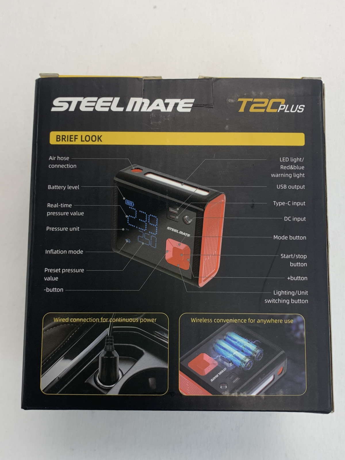 Двухпоршневой компрессор STEEL MATE T20 PLUS быстро накачивает шины автомобиля, мотоцикла, велосипеда. В устройство записано пять предустановленных режимов накачки с автоматическим завершением работы по достижению нужного значения давления.