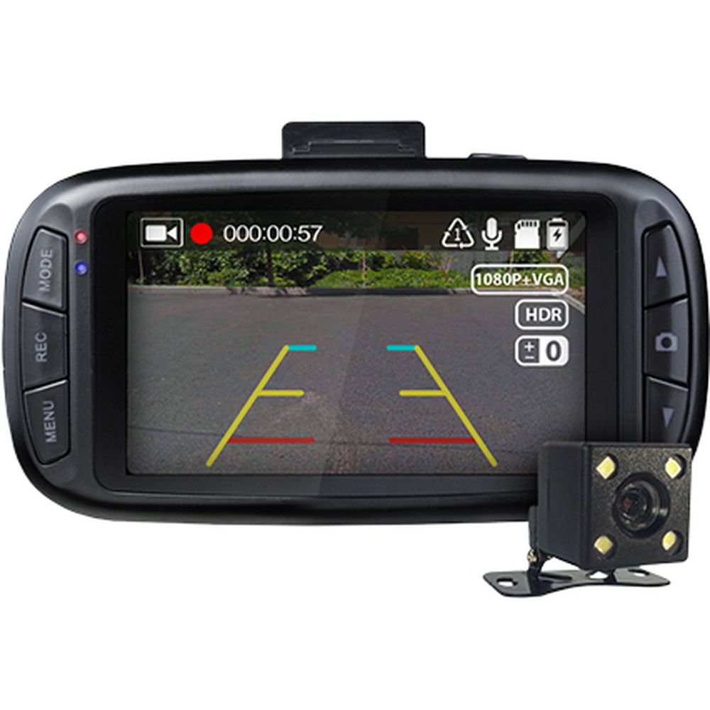 Full HD видеорегистратор на процессоре Novatek 96655 с дополнительной парковочной камерой, которая автоматически включается на задней передаче. Есть дисплей, G-сенсор, детектор движения, функция HDR.